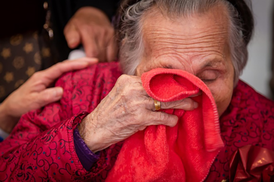89歲的馮鳳英老人在認親現場(chǎng),不斷擦拭眼淚。(央廣網(wǎng)發(fā) 通訊員 林安迪 攝)