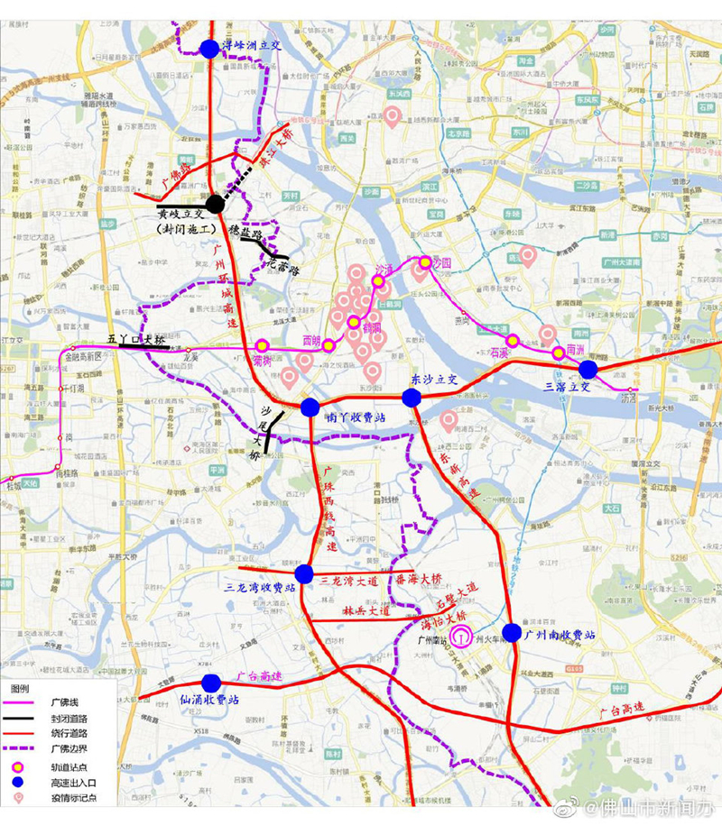 地方道路方面,結合廣州市封控區域道路管控情況,對佛山與廣州市封控區域接壤的道路:廣佛新干線(xiàn)(因道路施工前期已封閉)、穗鹽路、五丫口大橋、沙尾大橋等全部實(shí)施雙向封閉。
