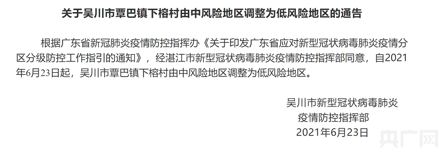 自2021年6月23日起,吳川市覃巴鎮下榕村由中風(fēng)險地區調整為低風(fēng)險地區。