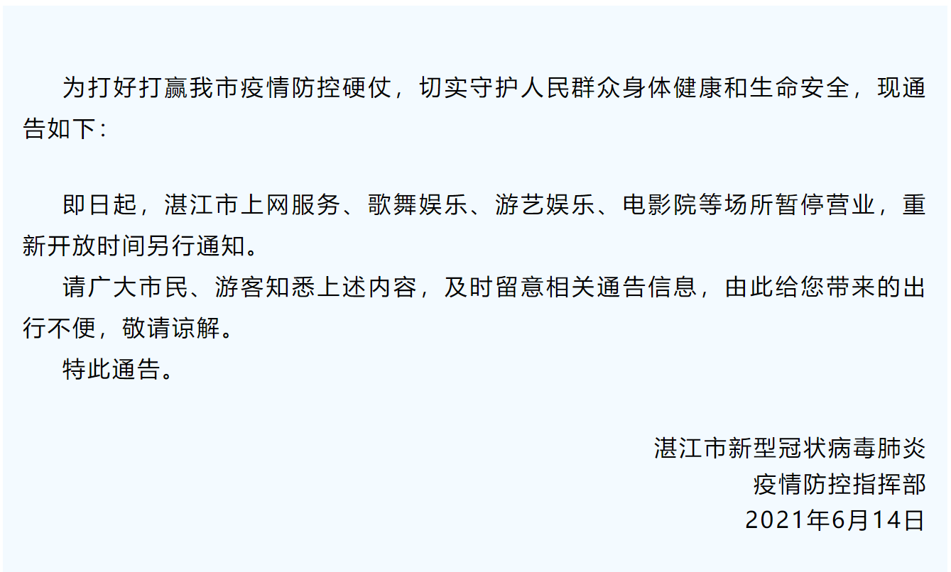 6月6日,吳川出現一例本土新冠病例。疫情發(fā)生后,湛江市新冠肺炎疫情防控指揮部立即啟動(dòng)應急預案,迅速開(kāi)展處置和流調溯源工作,排查密切接觸者,將患者轉運至定點(diǎn)救治醫院治療。同時(shí),部署進(jìn)行吳川市大規模核酸檢測,多次檢測全部陰性。湛江全市上下眾志成城、守望相助,確保了各項防控措施有力有效落實(shí)。