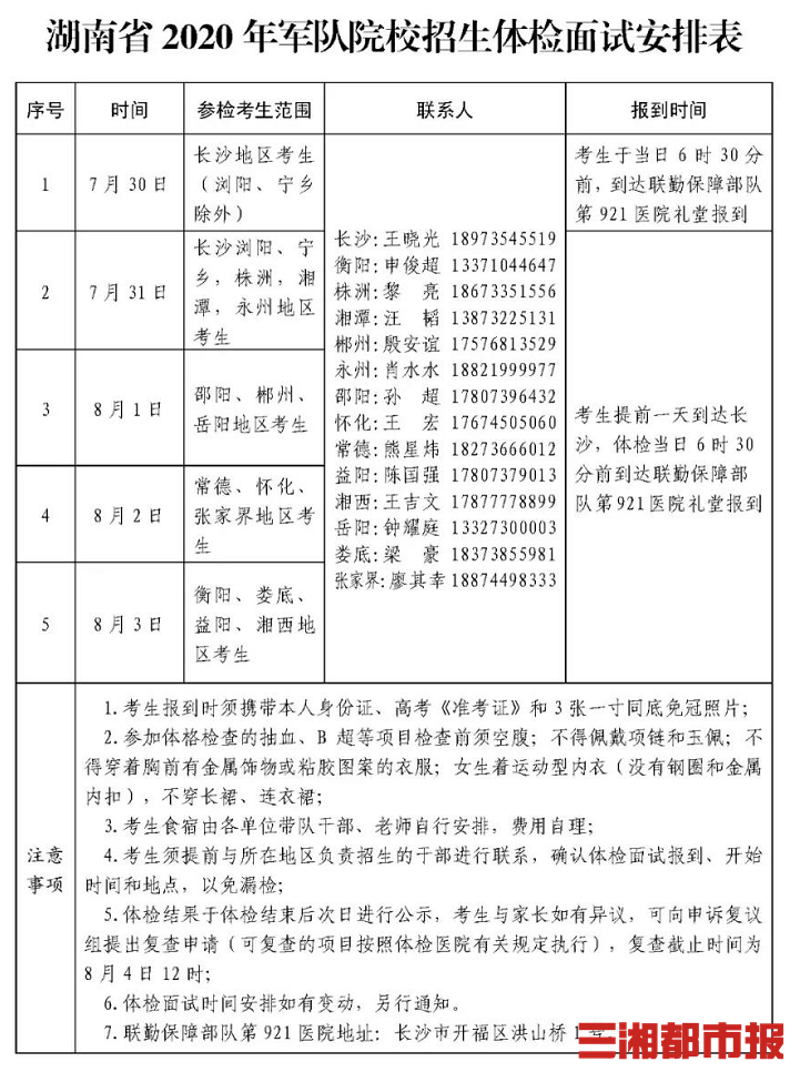 據悉,2020年湖南省軍校招生體檢面試工作在長(cháng)沙921醫院進(jìn)行(詳情見(jiàn)文末表格),考生需按照通知要求,于體檢當日6:30前到921醫院禮堂報到,經(jīng)工作人員防疫檢查、核對考生身份證和準考證后進(jìn)入待檢區,現場(chǎng)指揮員按10至20人一組進(jìn)行編組,編組后由引導員帶領(lǐng)該組考生前往候檢區等待,體檢、面試、心理測試交叉進(jìn)行。