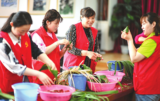 6月3日,志愿者和居民們正在開(kāi)心地一邊包粽子一邊嘮家常。當日,太原市迎澤街道青年路一社區志愿者提早備好原料,邀請社區困難家庭居民,歡聚一堂包粽子,共話(huà)美好生活。(記者李兆民攝)